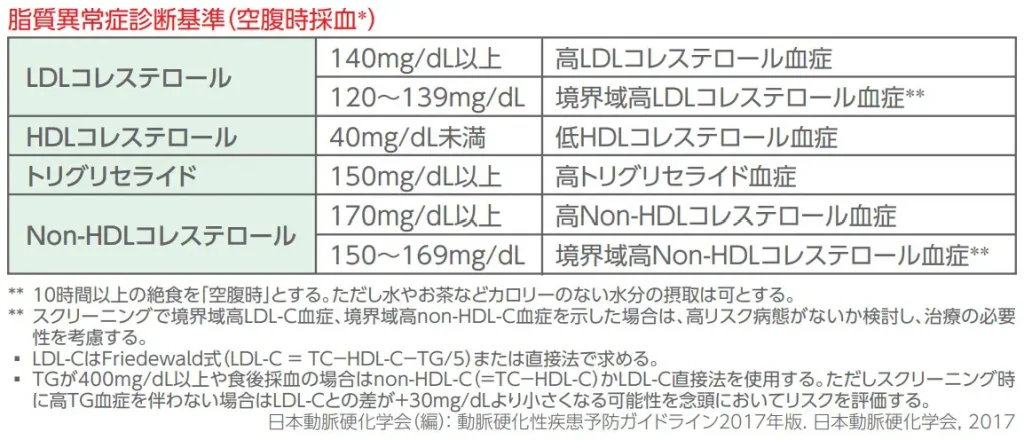 健康診断を受けた際に、下記のような数字になっていたり、近くなっている場合、脂質異常症の可能性がありますので、動脈硬化になる前にご相談ください。